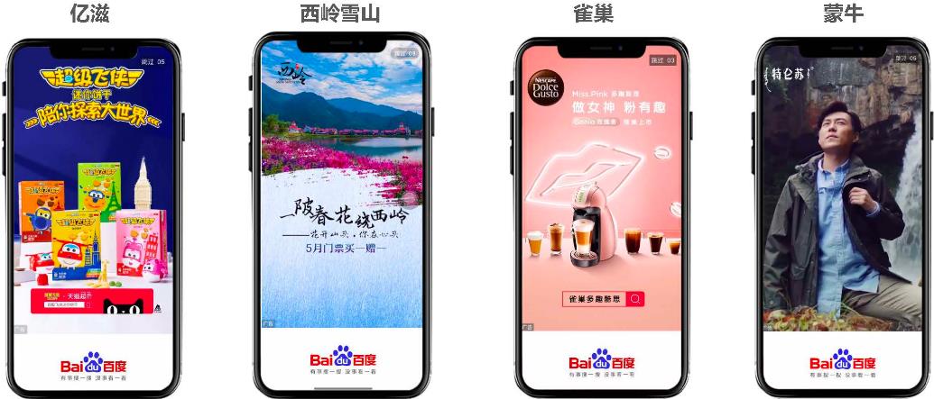 百度開屏廣告有四種展現(xiàn)形式,分別是3-5s靜態(tài)全屏/非全屏樣式、動(dòng)態(tài)視頻全屏/非全屏樣式、搖一搖樣式和九宮格樣式。采用全屏覆蓋的展示形式可以集中用戶的注意力,吸引用戶眼球,提高點(diǎn)擊率。
