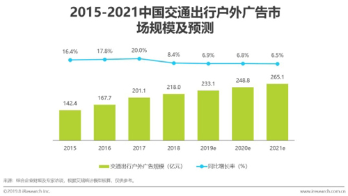 根據艾瑞咨詢數據顯示,2018年中國交通出行場景戶外廣告市場規(guī)模達218億元,同比增長率為8.4%。艾瑞分析認為,未來交通出行中戶外廣告的發(fā)展穩(wěn)定。一方面是因為交通場所建設和人流量都有著穩(wěn)定的規(guī)劃和控制,且交通場所的商業(yè)化滲透率也較為飽和,因此從供給和需求上都不會產生大的變化;另一方面,由于交通場所的公共安全屬性,難以出現通過增加單位場所內的廣告資源類型或數量來實現新的增長。