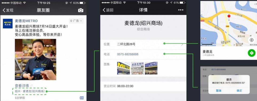 廣告落地頁可配置“查看詳情”、“領(lǐng)取優(yōu)惠”或“預(yù)約活動”,點(diǎn)擊后跳轉(zhuǎn) H5詳情模板頁(支持收集信息或品牌推廣)、公眾號文章;點(diǎn)擊門店標(biāo)識,跳轉(zhuǎn)門店詳情頁。