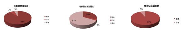 1、北京南站,高鐵數量占比88%,勱車數量占比7%,普速列車數量占比5%。通過對比顯示,北京南站發送列車主要以高速列車為主,包含京津城際、京滬線、京哈線
