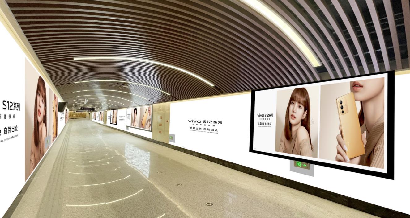 位于通道入口 ,正對地鐵站廳,雙側超大燈箱+墻貼直面乘客, 利于產生直觀品牌印象,提升品牌認知度