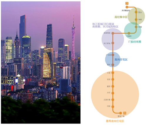3號線 ——高端CBD線:3號線與1號線、3北線、5號線、8號線及APM線同時(shí)接軌,連接了廣州最高端的商務(wù)區(qū)(珠江新城)、最繁華的商業(yè)區(qū)(天河城)、最高檔的住宅區(qū)、最高密度的IT數(shù)碼商圈(崗頂)、以及廣州多個(gè)重點(diǎn)院校(華工、華師和華農(nóng)),匯集了高密度的高端素質(zhì)客流。