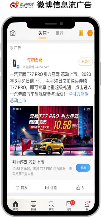 當(dāng)我們刷微博的關(guān)注好友動態(tài)時,總是會不經(jīng)意點(diǎn)擊進(jìn)入一個信息流廣告中,不管是圖片、文字還是視頻,其呈現(xiàn)和普通用戶發(fā)出的微博動態(tài)毫無二致,但其推送的內(nèi)容經(jīng)常都是非常符合用戶需求的,如果仔細(xì)觀察,可以看到其推廣賬號并不在關(guān)注欄中,而單純是由微博推薦到動態(tài)當(dāng)中的。用戶們會在不經(jīng)意間被這樣的廣告所迷惑,會因?yàn)槠渫蝗怀霈F(xiàn)在資訊動態(tài)中而難以忽視,同時,用戶也可能刷到感興趣的廣告信息而產(chǎn)生關(guān)注。